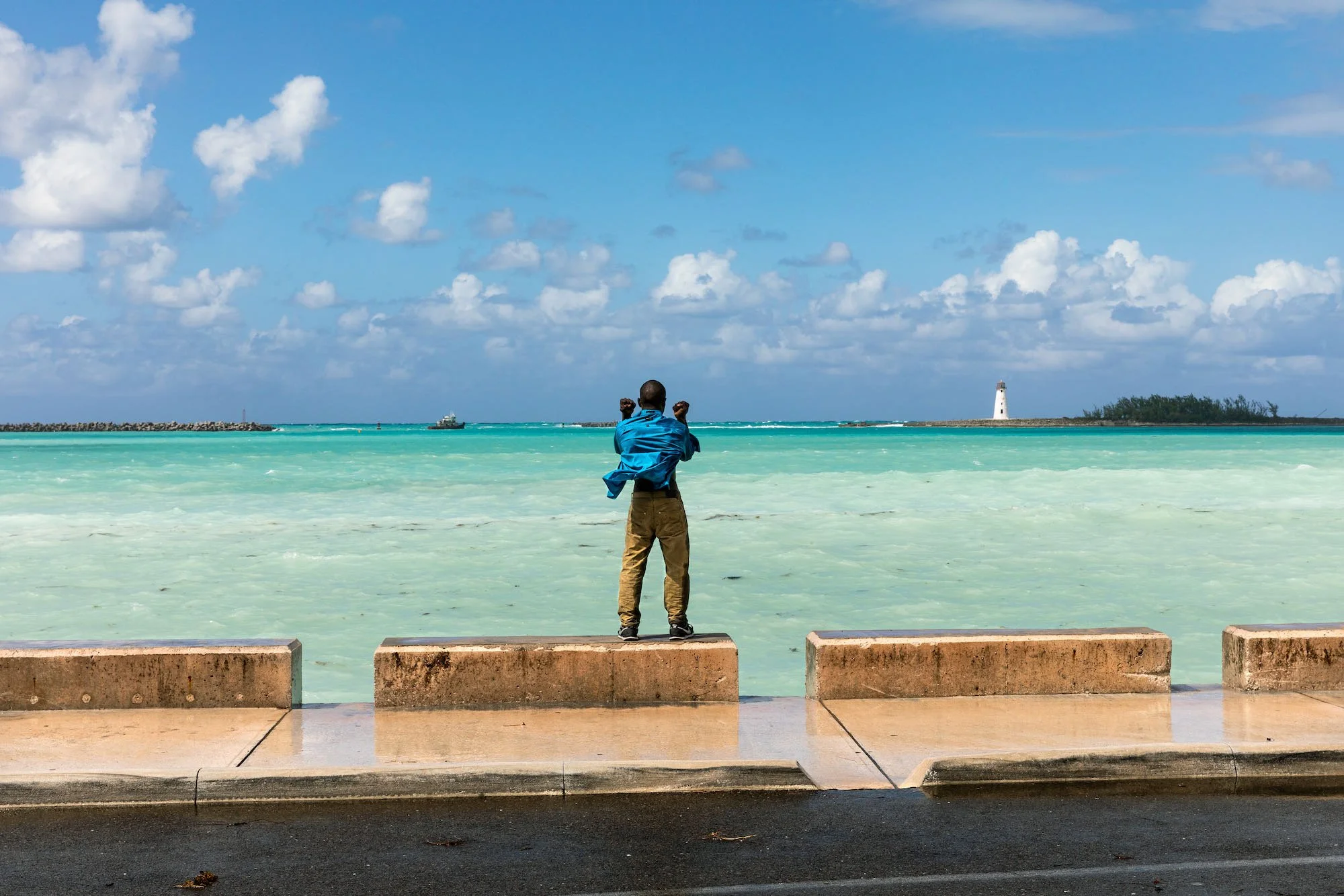 Un uomo di spalle si trova su un muretto davanti all'oceano, con una barca e un faro sullo sfondo, cielo sereno con nuvole.