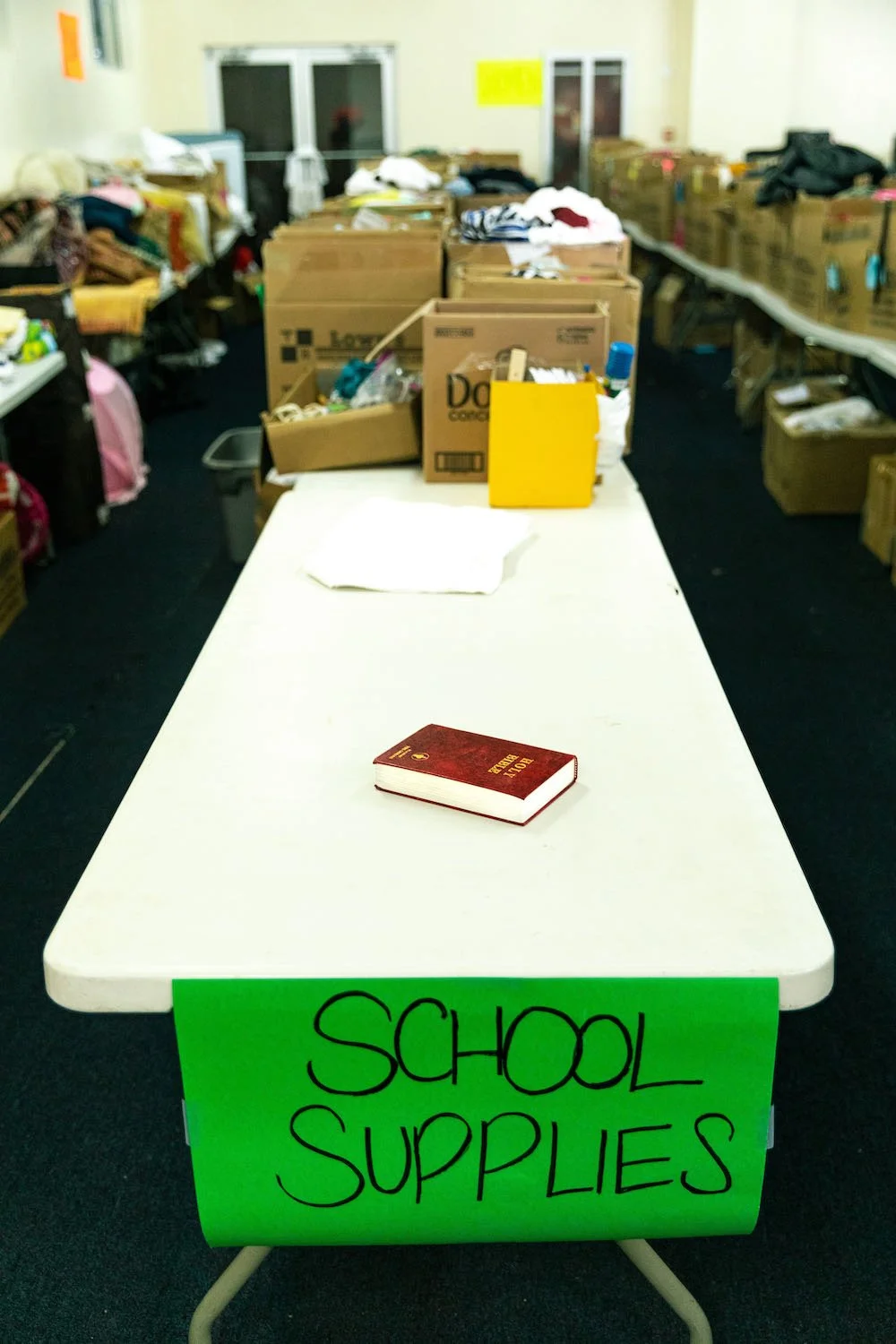 Sala con tavoli dividiti in sezioni per uomini e ragazzi, con scatole e vestiti, segnalate da cartelli gialli con scritte 'MEN', 'BOYS' e 'GIRLS', e persone che lavorano o assistono.